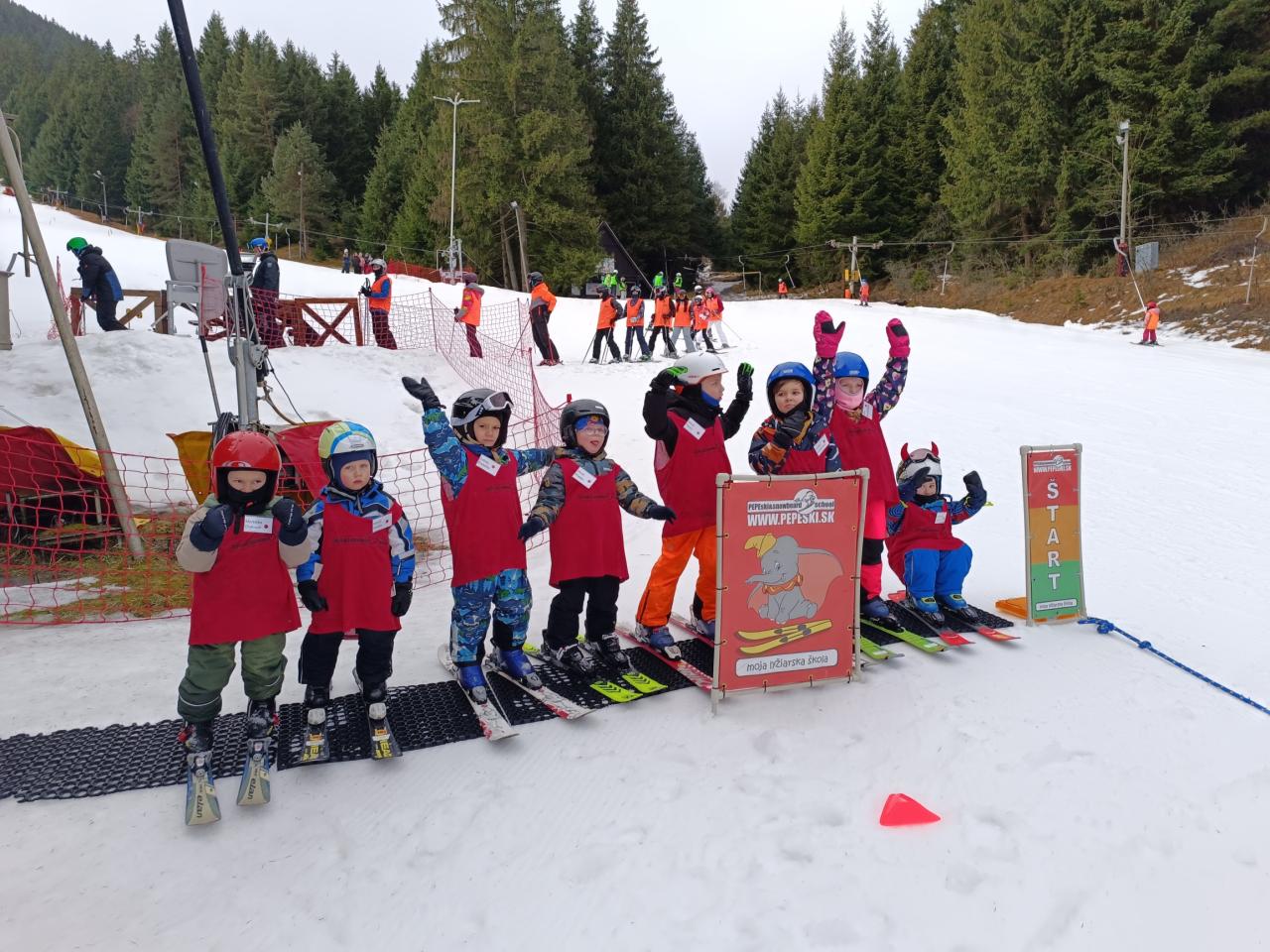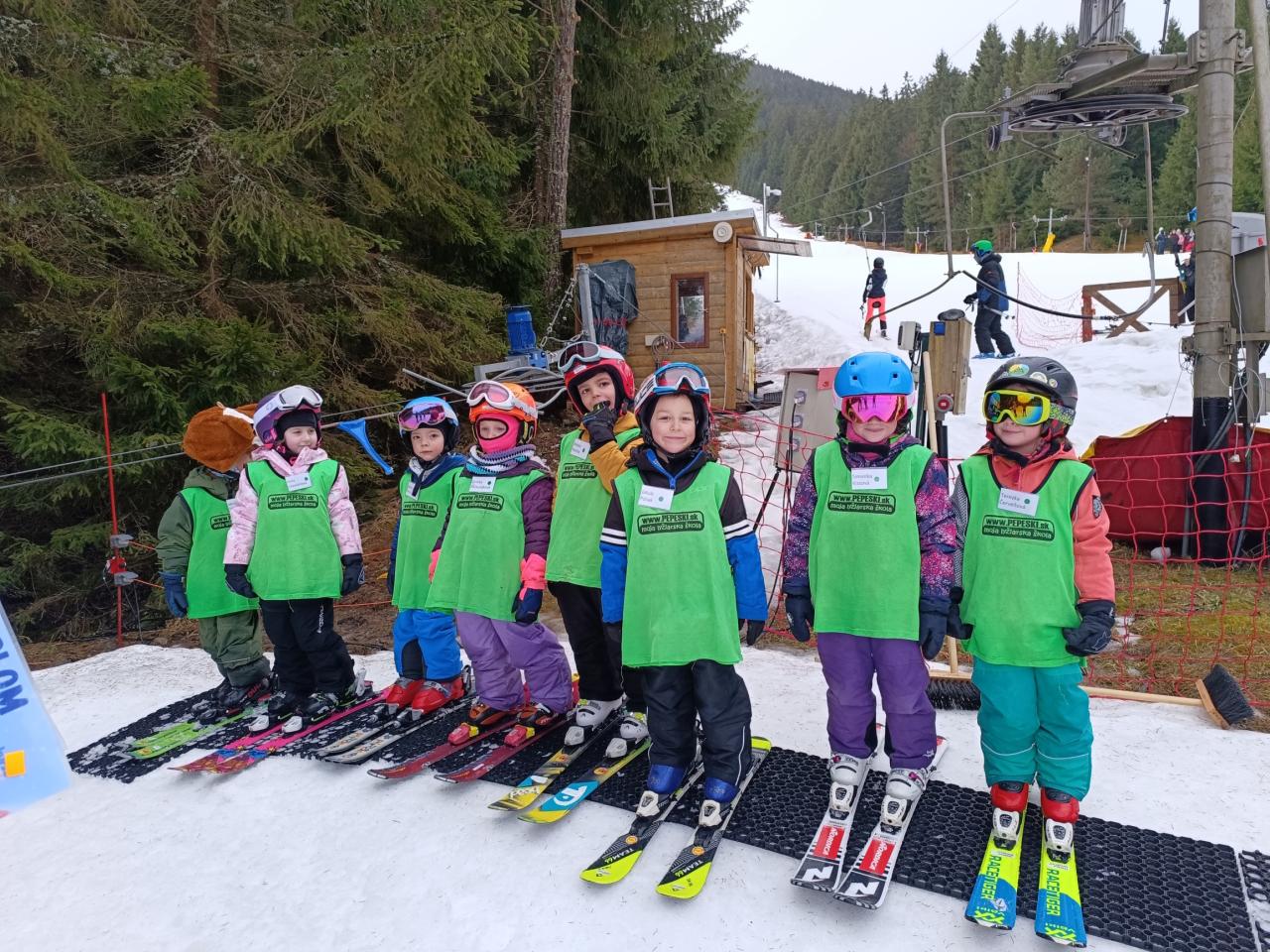 Tento mesiac sme odštartovali poriadne športovo! Deti z tretej triedy a časť našich druhákov vymenili papučky za lyžiarky a vyrazili na svah. Ráno začali veselou rozcvičkou, po ktorej inštruktori rozdelili deti do troch skupín podľa svojich zručností. Pod ich vedením trénovali správnu techniku, jazdu na vleku, zdolávanie prekážok, oblúčiky, brzdenie , prenášanie váhy a dokonca aj malé skoky. V závere výcviku malí lyžiari predviedli svoje schopnosti pred hrdými rodičmi. Za ich statočnosť a šikovnosť dostali diplom, sladkú medailu a v Bufete u Fera ich čakala zaslúžená odmena – fantastické sladké palacinky od uja Janka Mlynčeka, ktorým sa nedalo odolať!