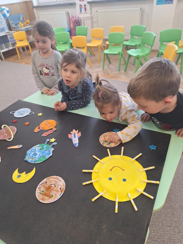 Po živloch sme sa preniesli ešte ďalej – do vesmíru. Najmladšie „motýliky“ objavovali, že Zem je guľatá, zoznámili sa s rôznymi krajinami a pomocou „turistického sprievodcu“ symbolicky precestovali svet. Staršie deti spoznávali vlajky štátov a dozvedeli sa nové zaujímavosti o planéte, na ktorej žijeme. Najstarší sa vydali až do nekonečna – putovali vesmírom, učili sa o planétach aj o výrazných súhvezdiach, ktoré môžeme vidieť na nočnej oblohe.