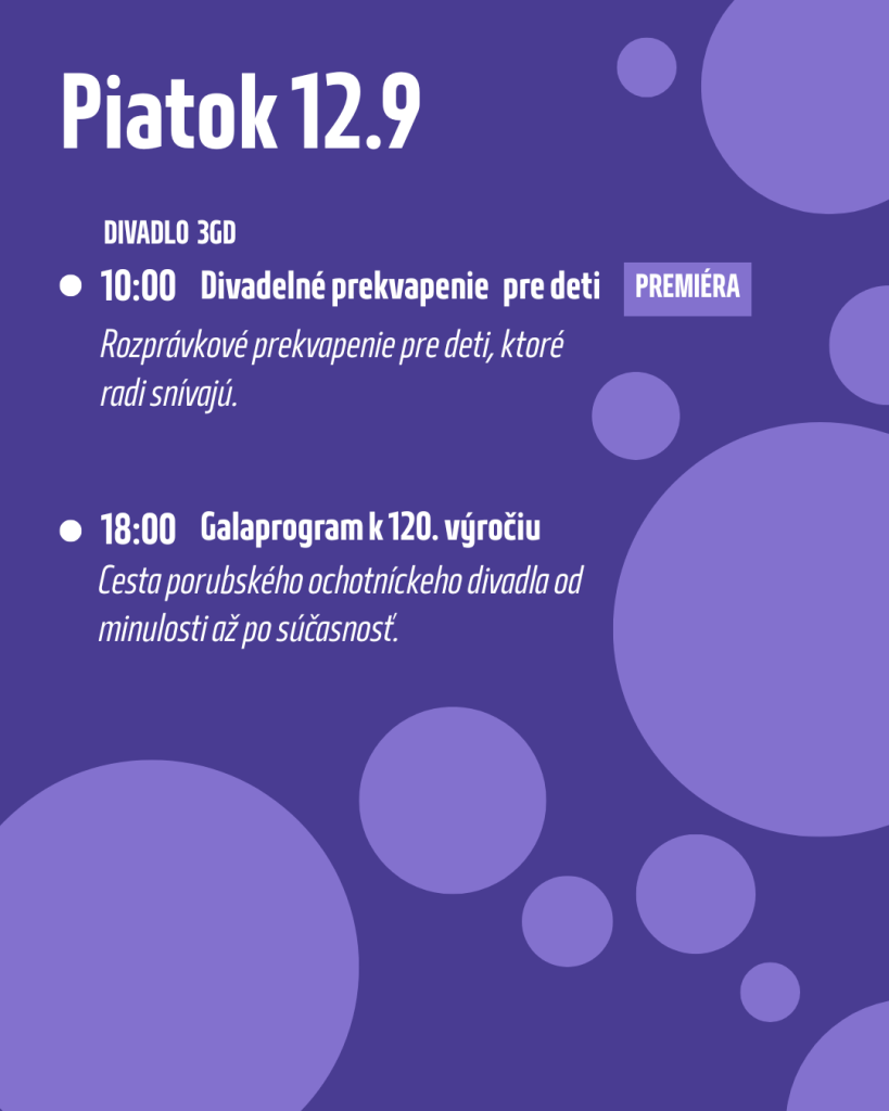 Divadlo 3GD a obec Závažná Poruba Vás pozývajú na oslavy 120. výročia porubského ochotníckeho divadla, ktoré sa budú konať od 12.9 - 13.9.2025.