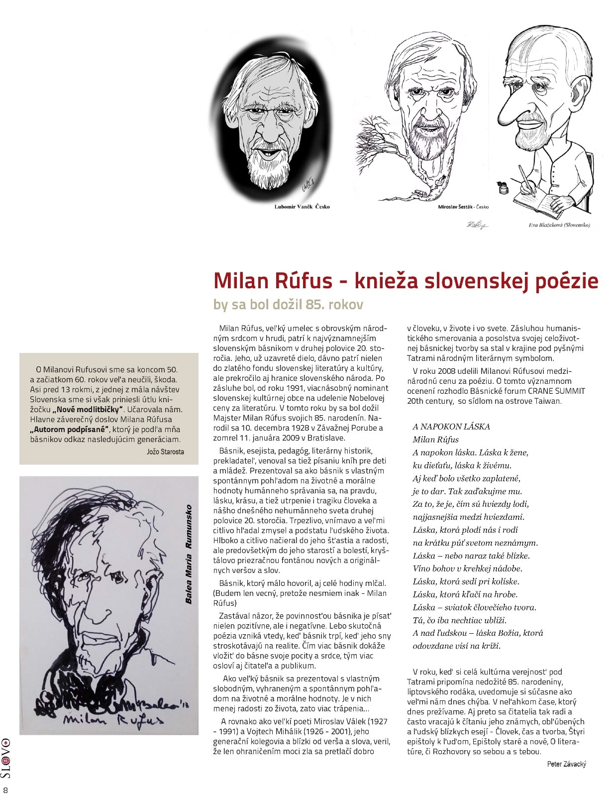 Reč je o Milanovi Rúfusovi (1928-2009), jednom z najvýznamnejších slovenských básnikov v druhej polovice 20. storočia, poetovi s národným srdcom v hrudi, ktorý veľkosťou svojho diela (ktoré už dávno patrí do zlatého fondu slovenskej literatúry a kultúry) prekročil hranice slovenského národa.